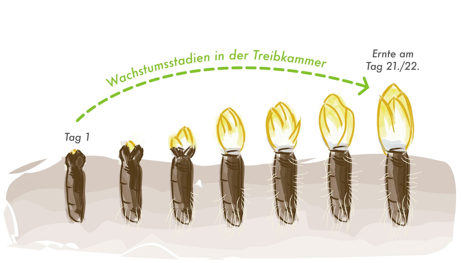 Die Chicorée-Pflanze ist eine zweijährige Kultur. Ihre Produktion wird in drei Phasen unterteilt. Im Frühjahr wird das Chicorée-Saatgut ausgesät. Im Herbst werden dann die Wurzeln geerntet und bei -1°C solange gelagert, bis sie für die Treiberei benötigt werden. Nach dem Auftauen der Wurzeln folgen 21 Tage, indenen in der Treiberei ein Spross herangezogen wird – jetzt ist der allseits bekannte Chicorée-Salat bereit geliefert und verzehrt zu werden.